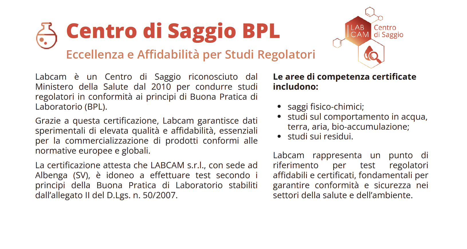 La certificazione attesta che LABCAM s.r.l., con sede ad Albenga (SV), è idoneo a effettuare test secondo i principi della Buona Pratica di Laboratorio stabiliti dall’allegato II del D.Lgs. n. 50/2007.
